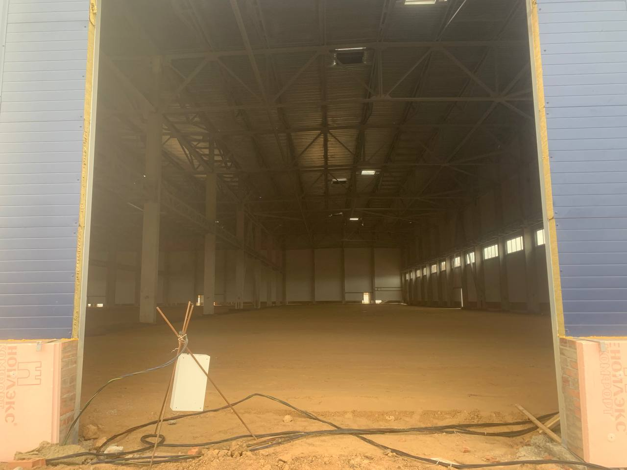 The usable area (production and warehouse type) is 6536 m2 (3 spans of 2179 m2 each), the floor height of the production and warehouse part is 10.8 m to the bottom of the farm, the height of the building to the roof is 14.75 m