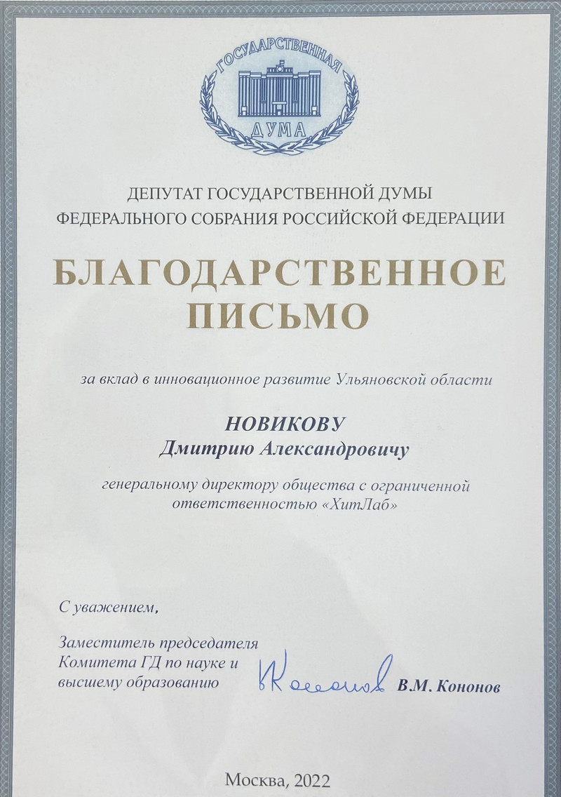 24 февраля Депутат Государственной Думы Федерального собрания РФ, член Комитета по науке и высшему образованию, вице-президент Всесоюзного общества изобретателей и рационализаторов (ВОИР) Владимир Кононов и председатель Центрального совета ВОИР Антон Ищенко отметили вклад компании ульяновского наноцентра ООО «ХитЛаб» в инновационное развитие Ульяновской области. Соответствующее благодарственное письмо получил генеральный директор «ХитЛаб» Дмитрий Новиков.