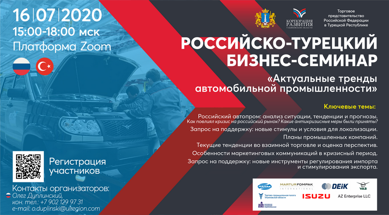 - Организатор – АО «Корпорация развития Ульяновской области» при поддержке Правительства региона, Торгового представительства Российской Федерации в Турецкой Республике и ведущих турецких промышленных ассоциаций. Модератором выступит руководитель компании AZ Enterprise LLC Алекс Загускин.
